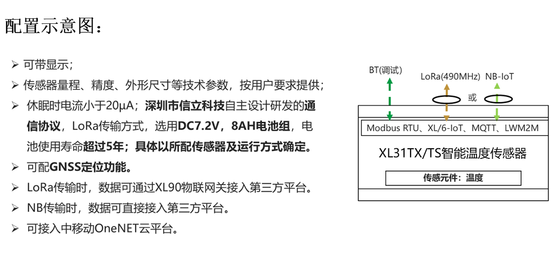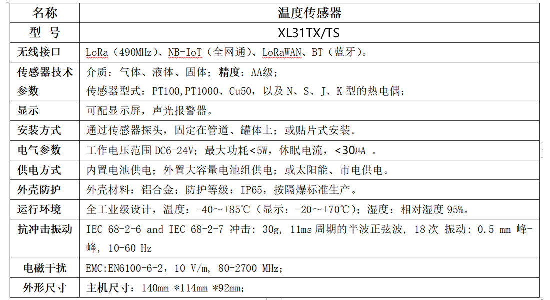 XL31TX/TS智能溫度傳感器,集成傳感元件、信息處理、無線通訊、電池供電等于一體。通訊中斷保存數據,通訊恢復重傳數據,超限主動上傳數據,電池能量低上傳報警數據。