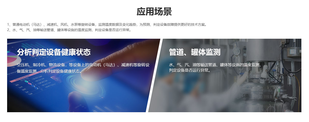 1、普通電動機(馬達)、減速機、風機、水泵等旋轉設備,監(jiān)測溫度數據及變化趨勢,為預測、判定設備故障提供更好的技術方案。 2、水、氣、汽、油等輸送管道、罐體等設施的溫度監(jiān)測,判定設備是否運行異常。