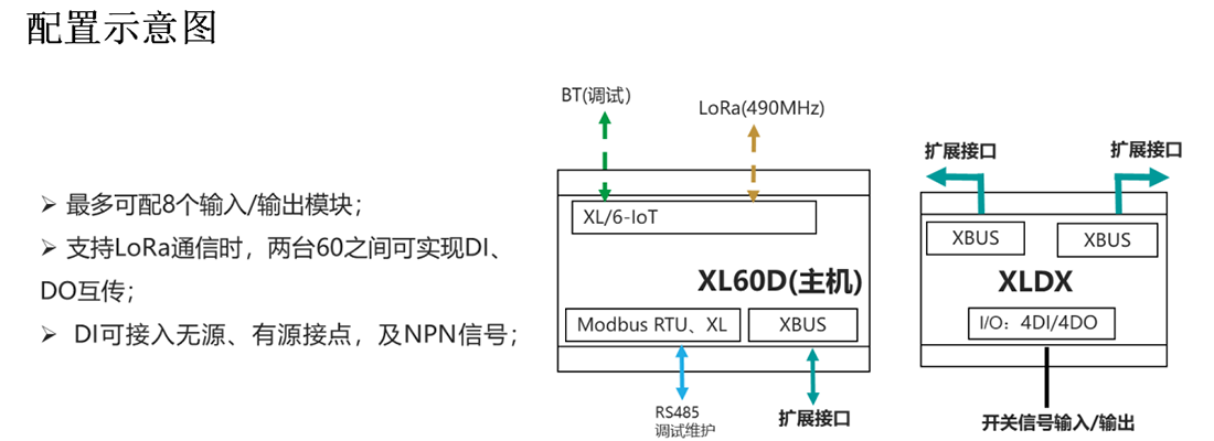 XL60D的通信方式是LoRa無線傳輸方式,每臺XL60D主機模塊,最多配兩個開關量I/O模塊。