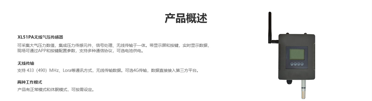 XL51PA無線氣壓傳感器,采集大氣壓力數(shù)值,集成壓力傳感元件、信號處理、無線傳輸于一體。帶顯示屏和按鍵,實時顯示數(shù)據(jù),現(xiàn)場可通過APP和按鍵配置參數(shù),支持多種通信協(xié)議