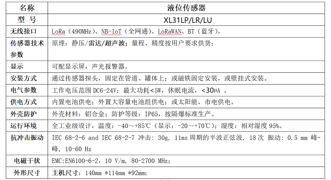 XL31LP智能液位傳感器,是按低功耗、隔爆標(biāo)準(zhǔn)研發(fā)、設(shè)計(jì)、生產(chǎn)。用于監(jiān)測(cè),儲(chǔ)罐,水箱、水池,管井、管溝,河流、湖泊,等水位。