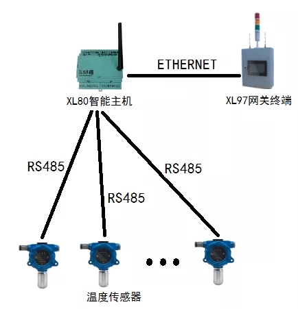 我司低溫檢測監測系統,選用XL97網關終端。通過采用RS485線的方式將各監測點的數據傳輸至XL80智能主機,智能主機再通過ETHERNET方式將數據上傳至XL97網關終端,網關終端將傳來的數據進行分析處理后,直觀的將監測點的實時溫度值顯示出來。