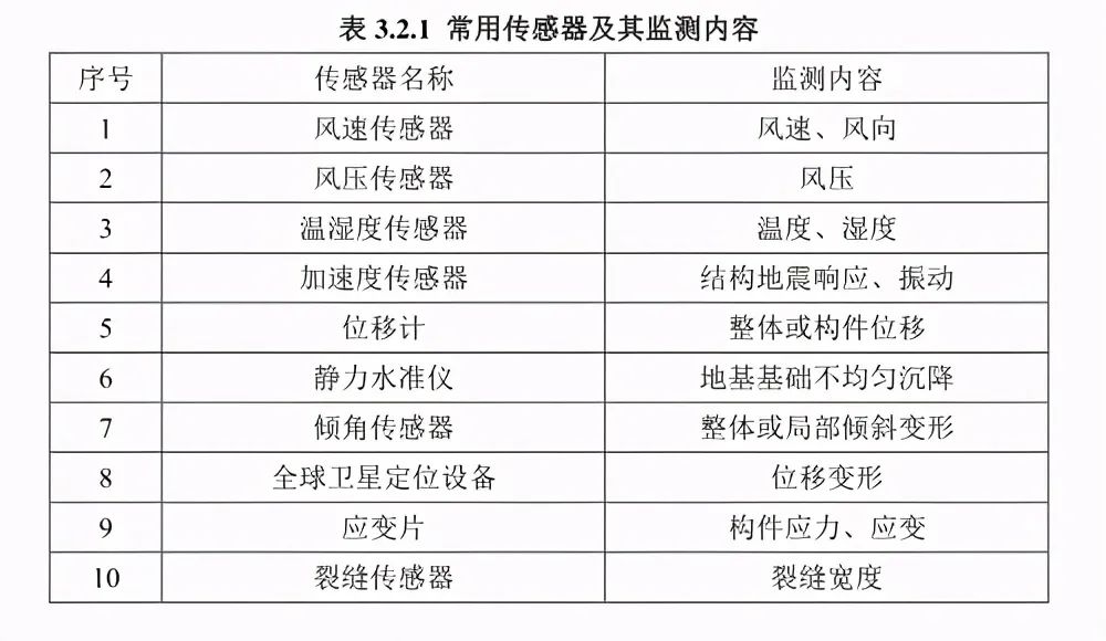 作為結(jié)構(gòu)檢測(cè)最為重要的內(nèi)容,傳感器起到了最為關(guān)鍵的作用。從結(jié)構(gòu)檢測(cè)常用的傳感器類型來(lái)看,風(fēng)速傳感器、風(fēng)壓傳感器、溫濕度傳感器、加速度傳感器、位移計(jì)、裂縫傳感器這些都是必備的,常用的傳感器及監(jiān)測(cè)指標(biāo)見(jiàn)下圖。