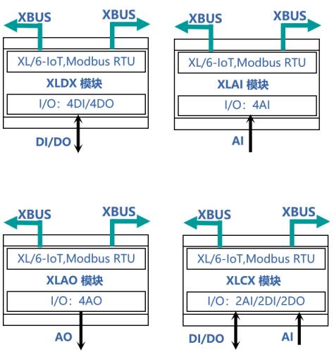 I/O模塊可選:XLDX4DI/0-4DO)、XLAI0-4AI)、XLAO(0-4AO) 。
