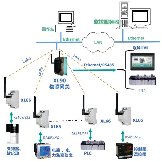 選擇 XL66 串口無線轉(zhuǎn)換器 ,接入控制儀表、變頻器等設(shè)備的 RS485/232 接口,讀取所需數(shù)據(jù),無線傳輸至網(wǎng)關(guān)節(jié)點(diǎn)。選擇 XL90 物聯(lián)網(wǎng)關(guān) ,作為無線接收端,轉(zhuǎn)發(fā)數(shù)據(jù)。
