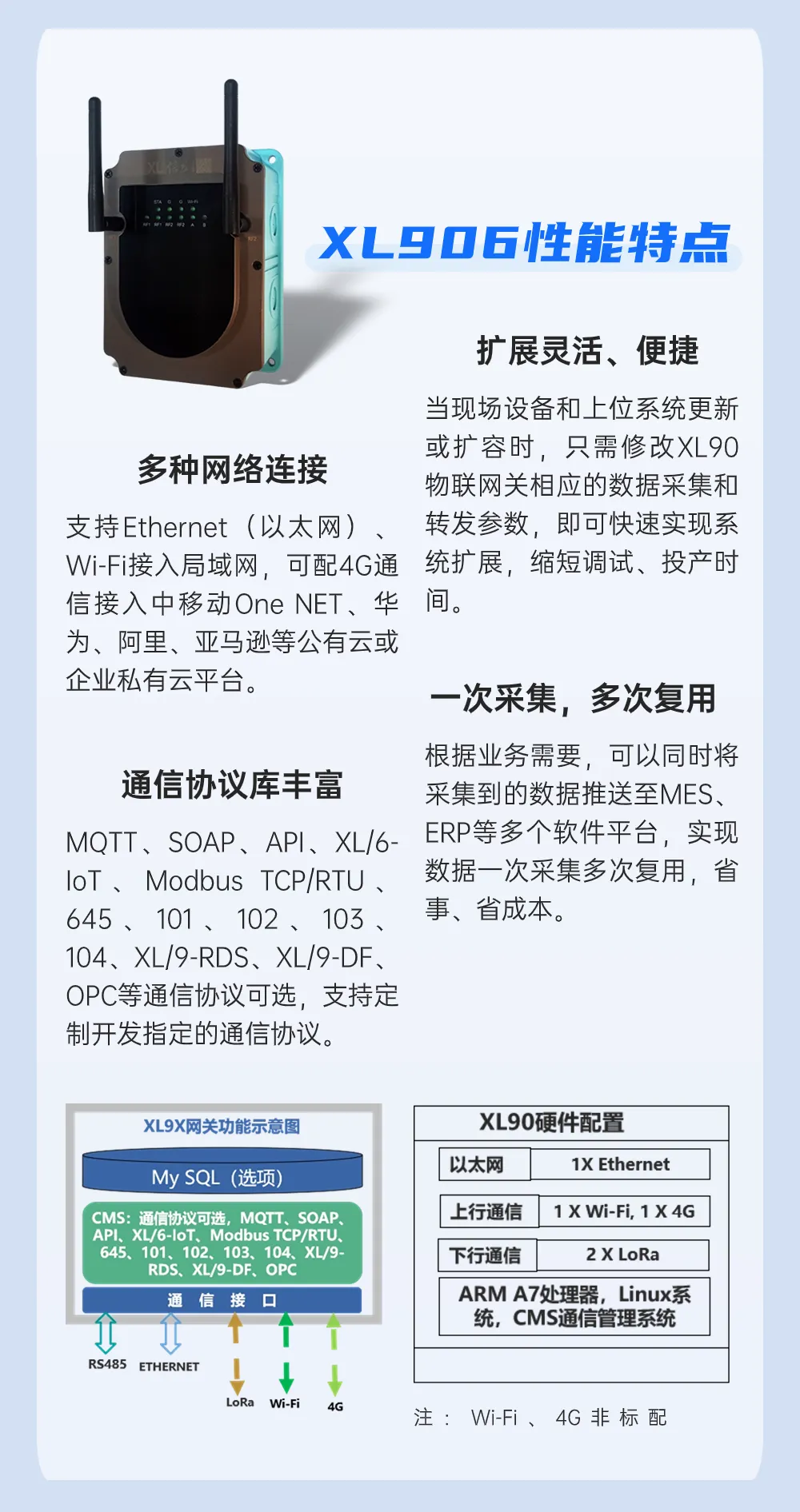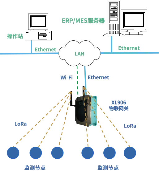 XL906物聯(lián)網(wǎng)關(guān),無線讀取監(jiān)測節(jié)點的數(shù)據(jù),進行處理、協(xié)議轉(zhuǎn)換,通過以太網(wǎng)(Ethernet)或Wi-Fi,轉(zhuǎn)發(fā)數(shù)據(jù)至MES、ERP、EMS等多個工廠數(shù)字化平臺,實現(xiàn)數(shù)據(jù)聯(lián)網(wǎng)、集中監(jiān)控分析。