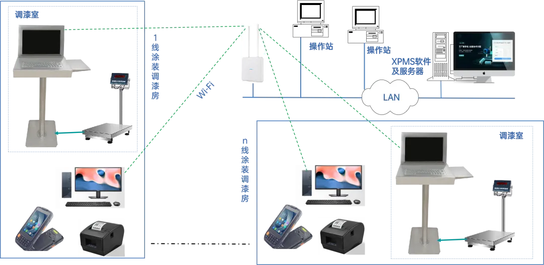 信立智能調漆系統由服務器及平臺軟件調漆終端出入庫終端Wi-Fi網絡構成。
