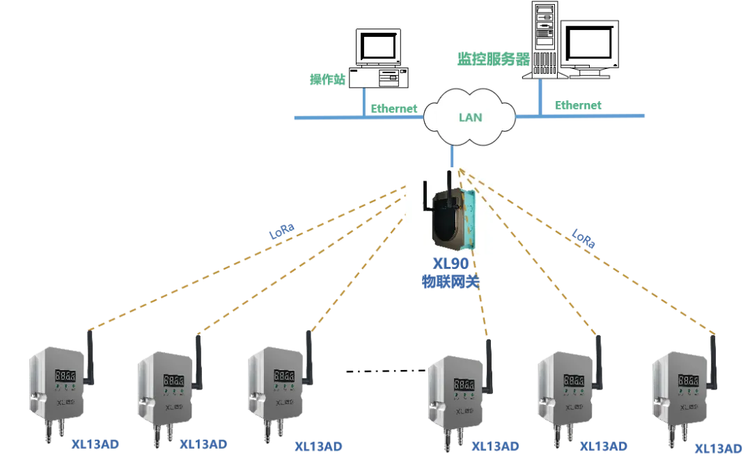 XL13AD無線壓差傳感器通過LoRa無線傳輸數據至XL906物聯網關,網關可選Ethernet、Wi-Fi4G等多種方式將壓差數據傳輸至監控平臺,實現遠程監測。